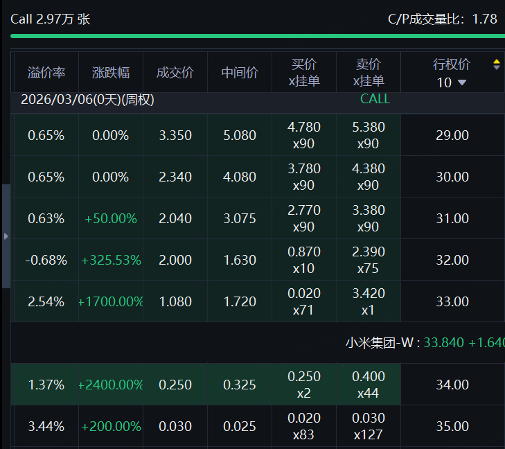 小米的认购合约价格全线拉升。一份今日到期的合约,行权价34港元,涨幅达2400%。