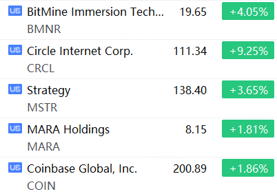 3月9日,部分加密货币概念股盘初走高,Circle涨超9%,BitMine Immersion涨超4%,Strategy涨超3%,Coinbase涨近2%。