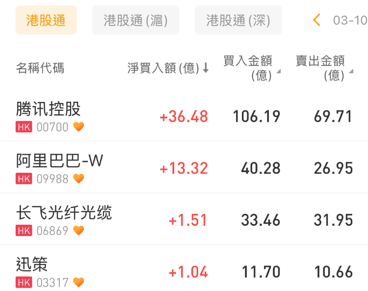 腾讯控股、阿里巴巴-W、长飞光纤光缆分别获净买入36.48亿港元、13.32亿港元、1.51亿港元;