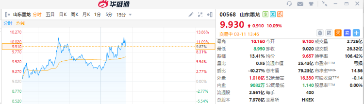 华盛资讯3月11日讯,原油期货短线走高,WTI原油期货及布油期货均转涨。港股油气股震荡走高,山东墨龙涨超10%,中石化油服涨近3%;中国海洋石油涨近5%,中国石油股份涨超2%。航运板块亦拉升,中远海能、中远海运涨超3%。