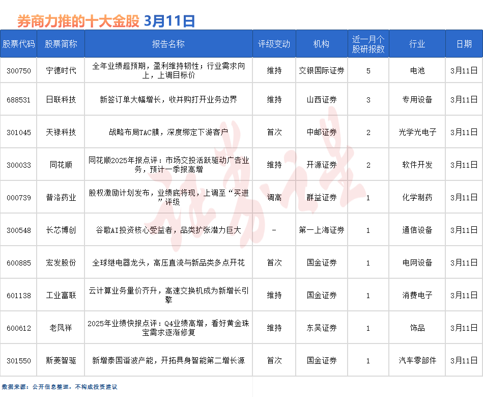宁德时代最受券商关注,近一个月获国金证券、东莞证券、东吴证券等5份券商研报关注,仅3月11日就有交银国际证券和中银证券等两份券商研报关注,位居3月11日券商力推股榜首。