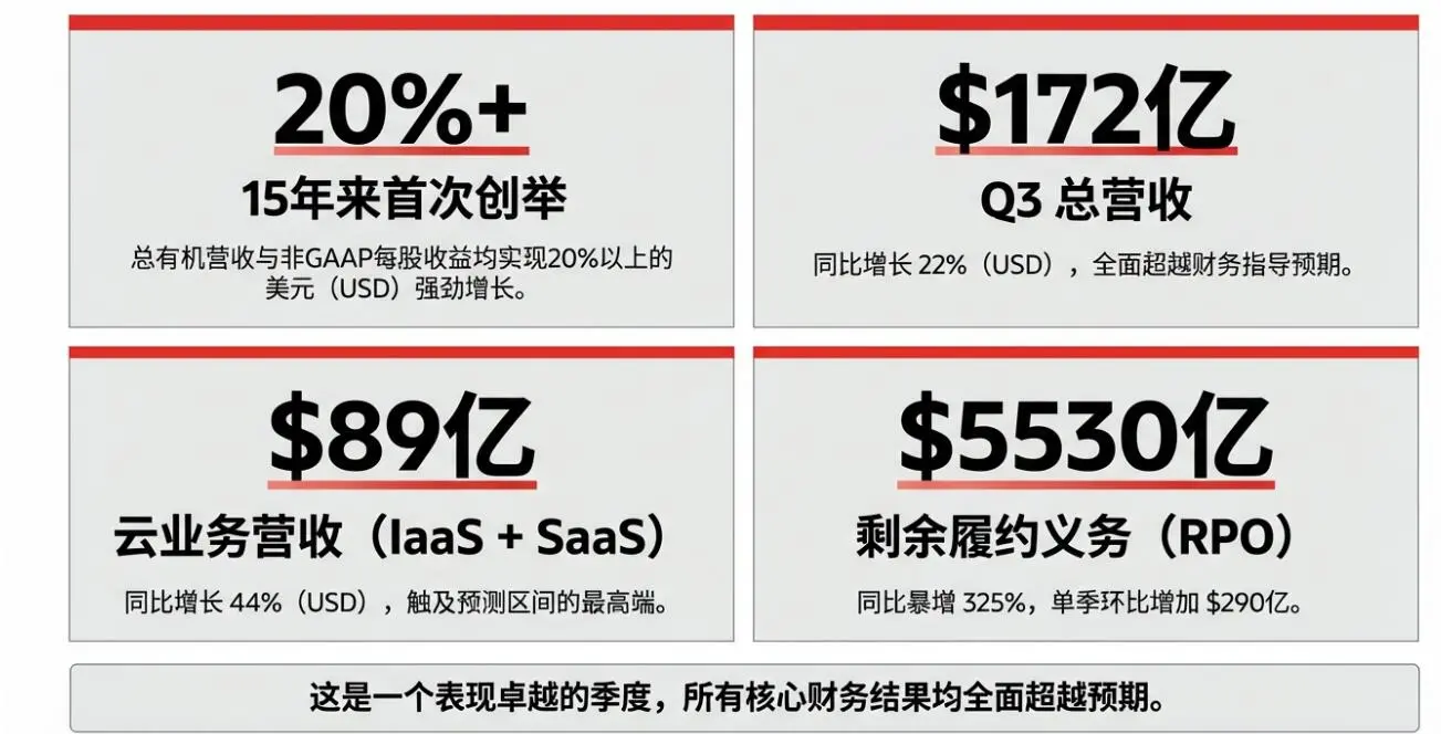 第三财季,甲骨文十五年来首次单季营收和EPS均涨超20%,云营收同比增44%,其中基础设施相关IaaS营收增84%;未来收入指标RPO大超预期增325%至5530亿美元,主要增量来自AI大单、由客户预付款或自购GPU支持;2027财年营收指引上调至900亿美元、年增34%;2026财年资本支出指引仍为500亿,前九个月支出同比增超两倍;预计2026自然年无需再额外发债。股价盘后一度大涨10%。