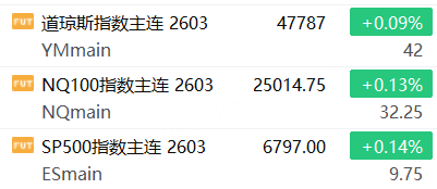 3月11日,美股三大股指期货上涨,截止发稿,道指期货涨0.09%,纳指期货涨0.13%,标普500指数期货涨0.14%。
