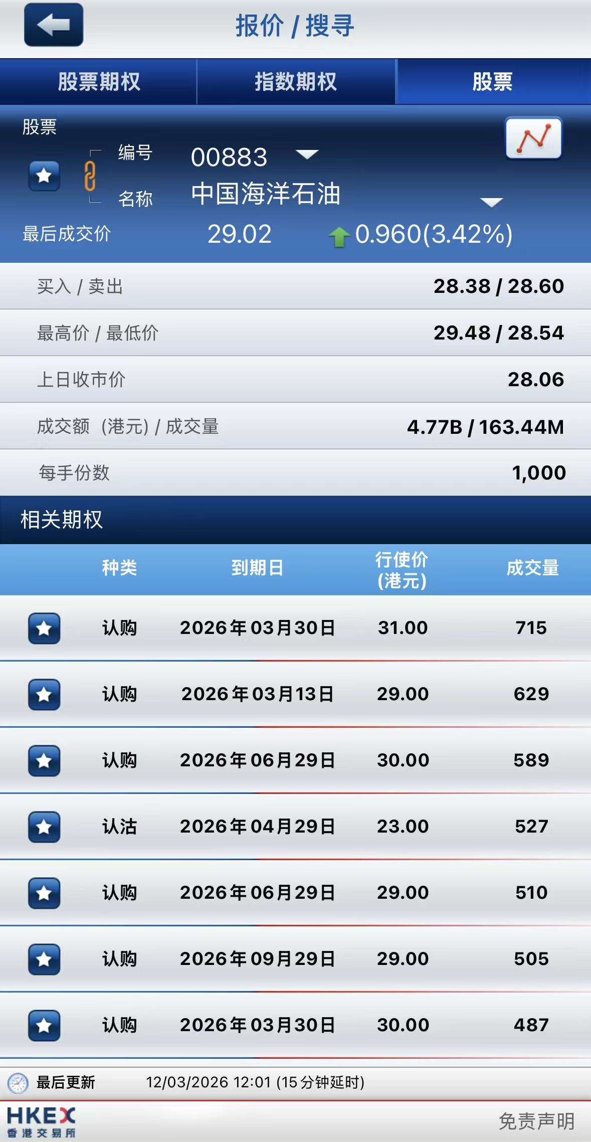 石油股延续上行趋势,中国海洋石油涨超3%,股价创历史新高,总市值1.38万亿港元。期权方面,中国海洋石油半日成交1.63万张,其中于3月30日到期行使价31港元的认购期权成交居前。