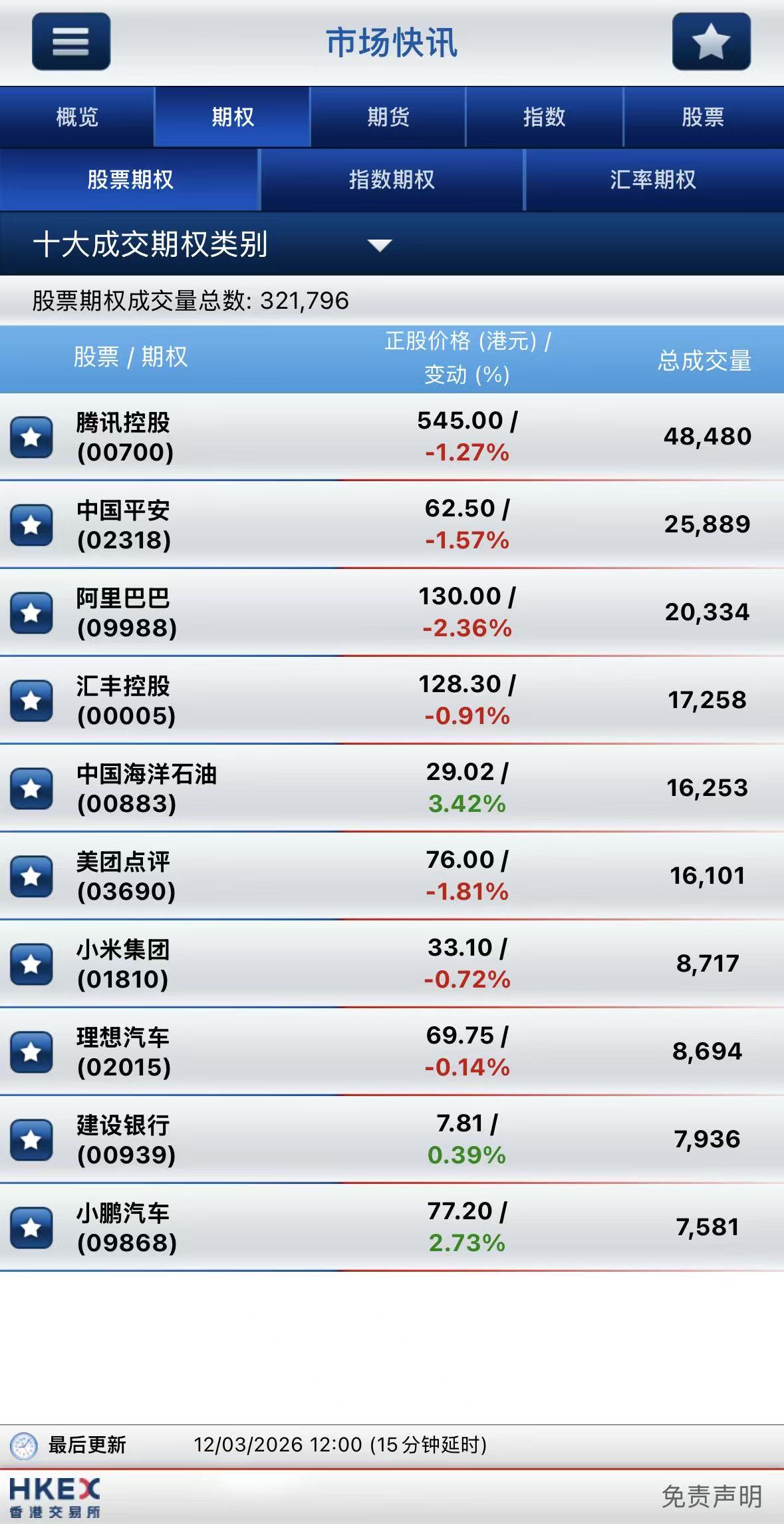 截止午间收盘,港股期权半日成交32.18万张,其中,腾讯控股成交量居首,期权成交4.85万张;中国平安名列次席,期权成交2.59万张;阿里巴巴位居第三,期权成交超2万张。