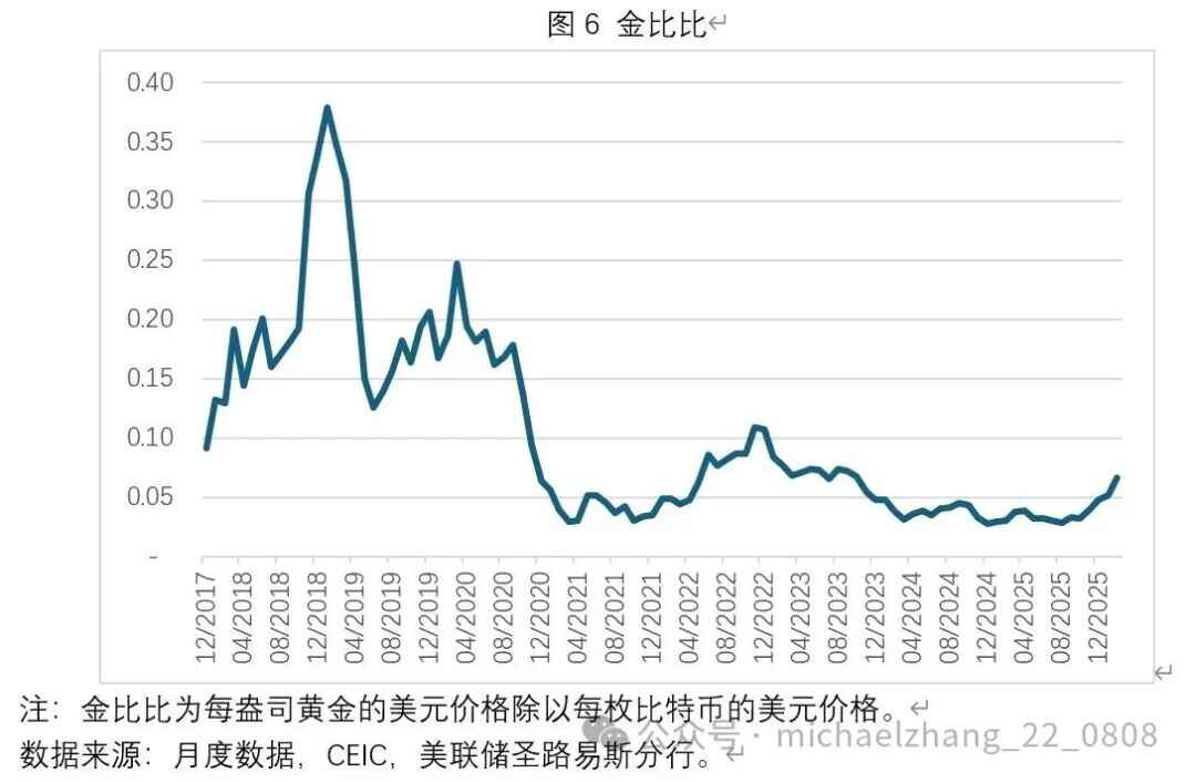 图5展示了2017年12月至2026年2月期间全球黄金价格与比特币价格走势。图6展示了同一时期内金比比的变化。不难看出,比特币的价格波动性显著高于黄金。自比特币价格在2025年10月创下每枚12.47万美元的历史性高位后至今,比特币价格与黄金价格走势之间呈现显著的负相关。自2021年至今,金比比大致在0.03-0.11的区间内波动。2021年1月至2026年2月,金比比的月度均值为0.05。