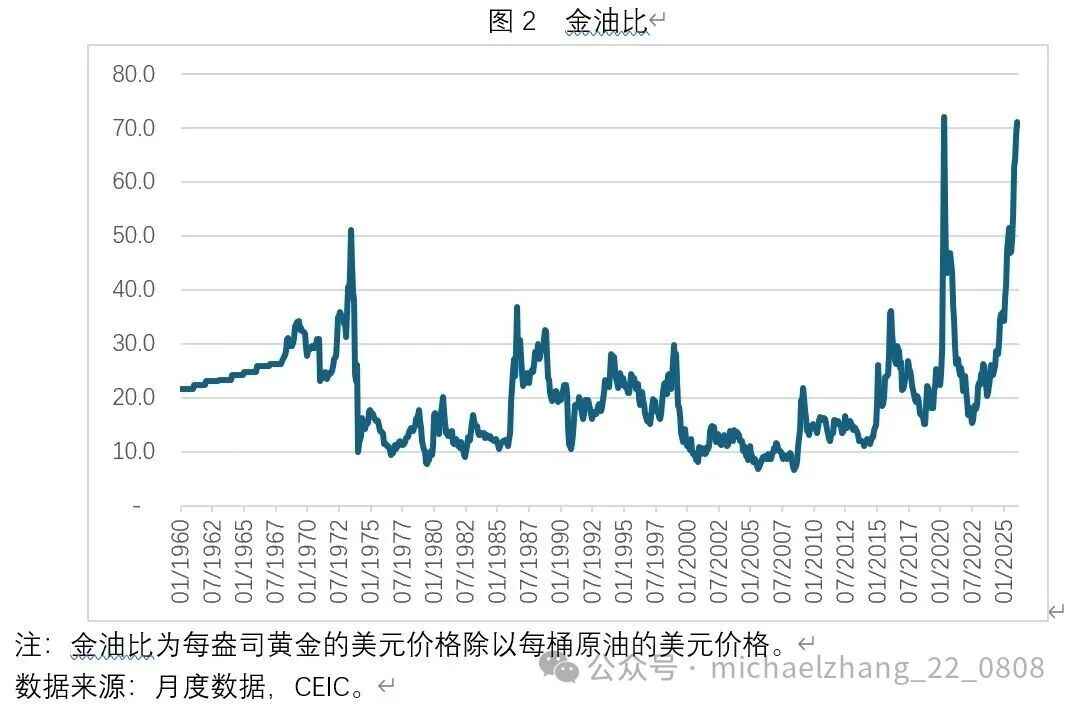 图1展示了1960年1月至2026年2月期间全球黄金价格与原油价格走势。图2展示了同一时期内金油比的变化。可以看出,在本次美以伊冲突爆发之前的2026年2月,金油比正处于历史第二高点,2026年1月与2月该比率分别高达71.2与70.6,仅次于2020年4月的72.1。2020年4月金油比之所以创出历史峰值,是因为当月原油价格仅为每桶23.34美元,创下自2002年2月以来的新低。相比之下,2026年1、2月原油价格在每桶70美元上下,这意味着当前黄金价格正处于历史新高。历史上金油比的第三高点为1973年6月的51.1,当时黄金与原油价格均处于历史较低水平。