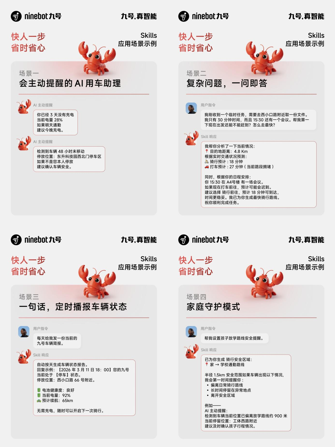 在九号公布的应用示例中,接入 AI Agent 生态后,智能电动车开始具备更主动、更智能的用车服务能力。AI 不再只是被动响应指令,而是能够在不同骑行场景中主动理解需求、提供决策辅助,逐渐成为用户的“AI 用车助理”。