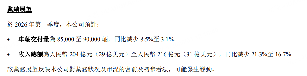 理想汽车预计2026年第一季度车辆交付量为85000至90000辆,同比减少8.5%至3.1%;预计营收为204亿元至216亿元,同比减少21.3%至16.7%。