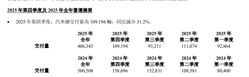 2025年第四季度,理想汽车总交付量为10.9万辆,同比减少31.2%。