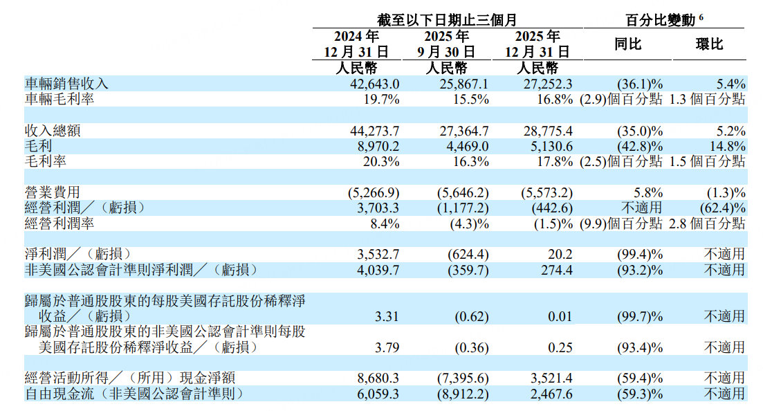 理想汽车第四季度车辆毛利率为16.8%,低于2024年同期的19.7%,但较2025年第三季度的15.5%有所回升。