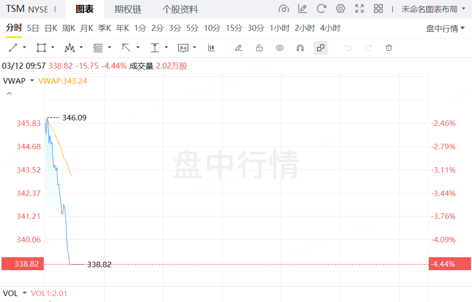 明星科技股多数走弱,台积电跌超4%,美光科技、英特尔跌近4%,阿斯麦、AMD跌超3%,英伟达、苹果跌超2%。