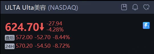 Ulta美容 夜盘跌近9%。公司四季度营收达到39亿美元,超过了市场预期的38亿美元,但每股收益为8.01美元,略低于分析师预期的8.03美元。公司对2026财年的业绩指引中值为摊薄每股收益28.30美元,略低于市场此前预期的28.40美元中值。