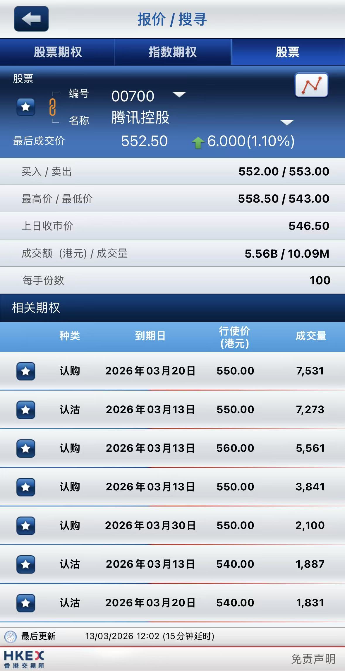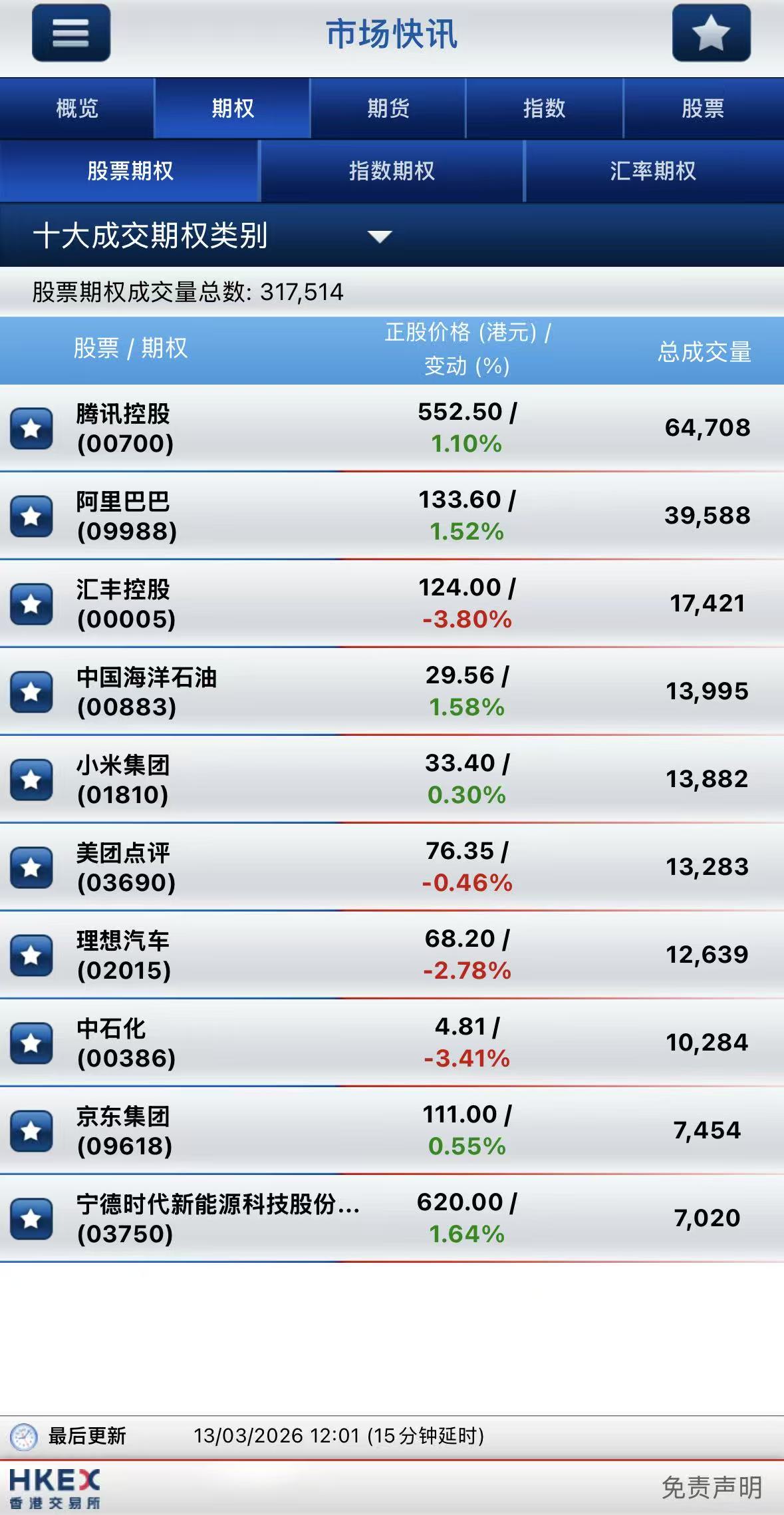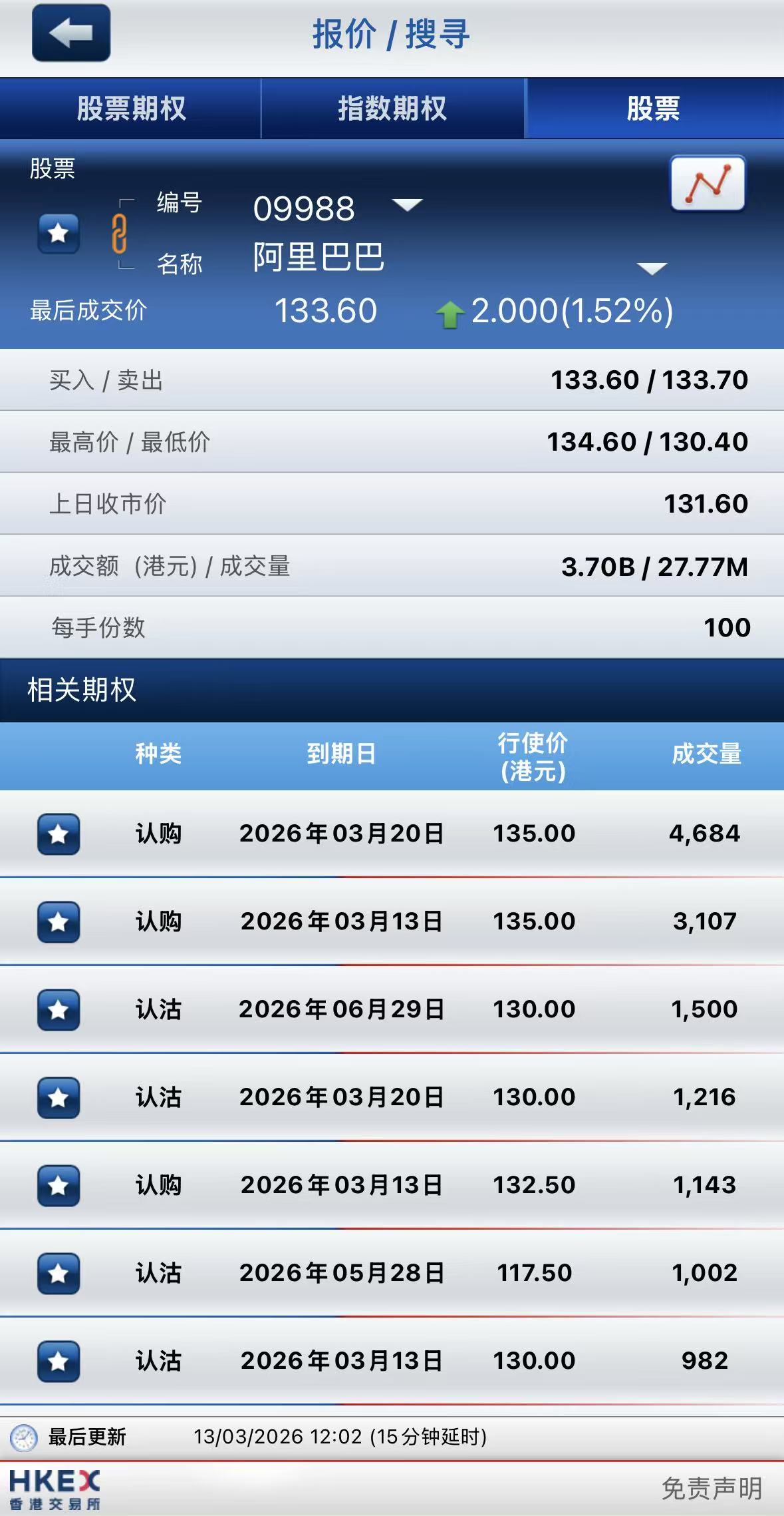明星科技股多数拉升转涨,腾讯控股、阿里巴巴均涨超1%,期权方面,腾讯控股半日成交6.47万张,其中于3月20日到期行使价550港元的认购期权成交居前,成交超7500张;阿里巴巴半日成交3.96万张,其中于3月20日到期行使价135港元的认购期权成交居前,成交近4700张。