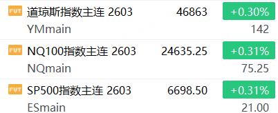 3月13日,美股三大股指期货上涨,截止发稿,道指期货涨0.30%,纳指期货涨0.31%,标普500指数期货涨0.31%。