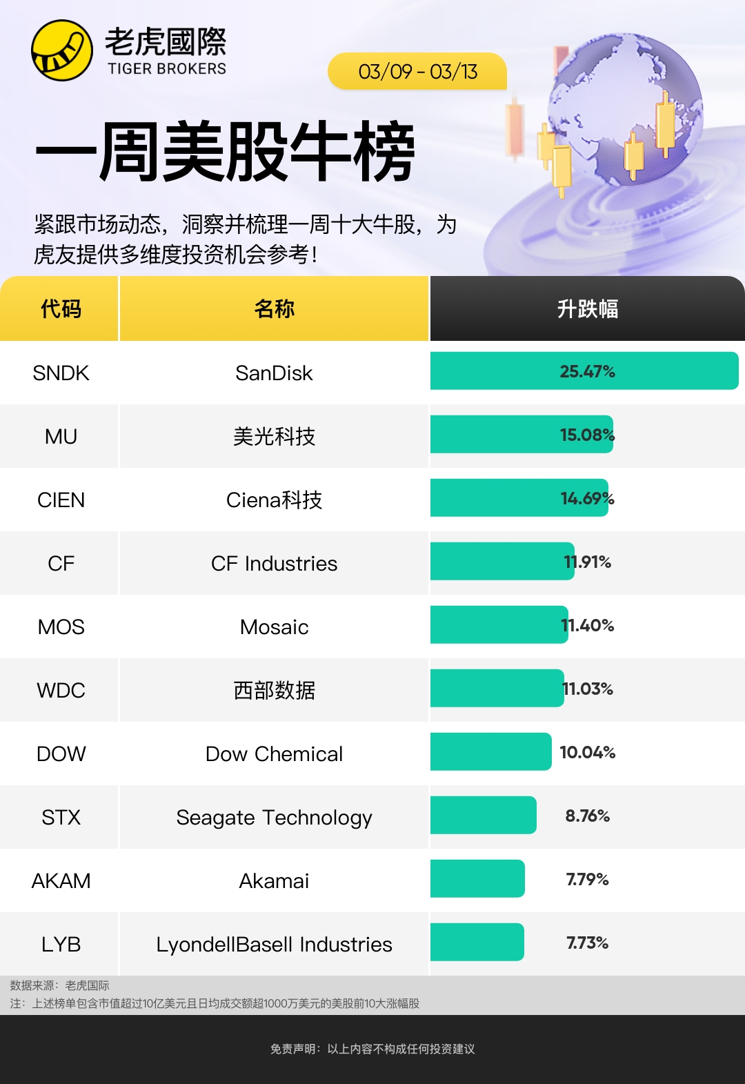 以下为截至3月13日当周S&P 500 Index涨幅前十的个股: