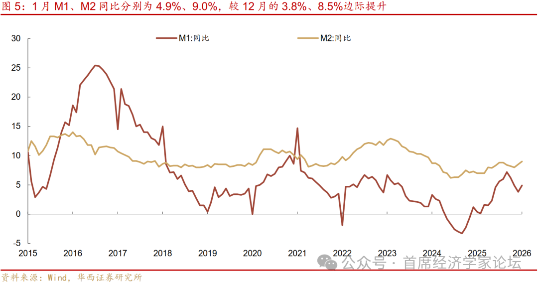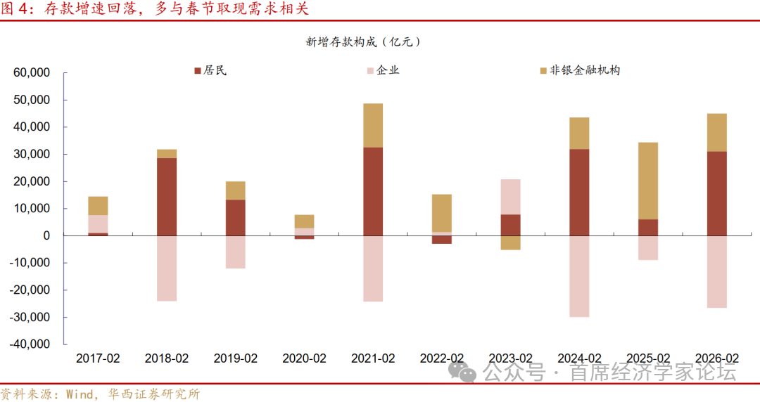 五是M1同比超预期回升,原因或与去年的存款定期化相关。春节月M0惯例大增,今年2月增幅为5261亿元,同比增速由2.7%提升至14.1%,但M1同比并未受影响,由4.9%提升至5.9%,显著高于市场预期的4.7%。回溯2025年2月,春节后居民存款定期化现象加剧,居民活期存款规模大降1.89万亿元,定期存款大增2.50万亿元。并且部分居民资金集中流入理财等非银产品,当月非银存款大增2.83万亿元,因而在M0回流存款的过程中,M1逆势下滑30087亿元,为今年形成了低基数背景。从总量规模变化看,2026年2月M1规模下滑20381亿元,体量与2024年同期(春节节奏相近)表现相近。