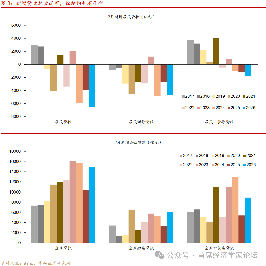 三是新增贷款总量尚可,但结构并不平衡。居民信贷仍需提振,2月新增居民贷款-6507亿元,同比少增2616亿元,其中短贷与中长贷表现均不乐观,新增居民短贷、中长贷-4693、-1815亿元,同比少增1952、665亿元。短贷数据或多受春节影响,如年终奖发放后,资金往往用于偿还消费贷等,参考2021、2022、2024年等春节月相似年份,2月新增居民短期消费贷分别为-3226、-2869、-3774亿元,均偏低。此外,春节歇业后居民短期经营贷诉求同样不强,过去五年,2月新增居民短期经营贷均值为203亿元,远低于1月、3月的3510、2007亿元,都是季度内低谷。不过地产销售数据(2月30大中城市商品房成交面积同比-33.5%)与新增居民中长贷表现双双指向,当下居民加杠杆买房的意愿仍偏低,后续重点关注“金三银四”的地产需求反弹幅度。合并1-2月数据,2025-2026新增居民贷款规模分别为547、-1942亿元,同比少增2616亿元,短贷、中长贷的同比拖累分别为1952、665亿元。