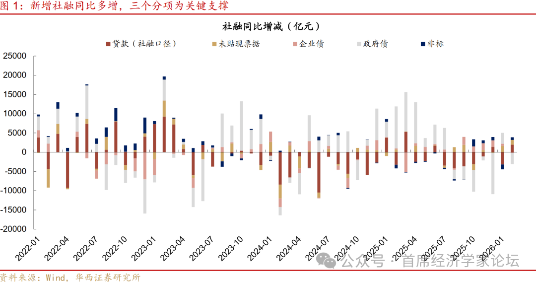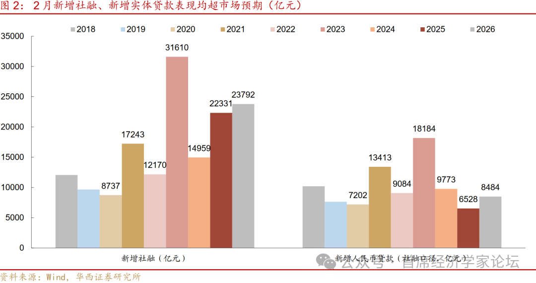 一是新增社融同比多增,三个分项成关键支撑。首先是政府债,2025年2月,地方债自春节后明显提速发行,当月社融口径新增政府债规模达到1.69万亿元,为全年之最;今年2月,地方债发行速率同样较1月边际提升,净发行10162亿元(远高于计划值7296亿元),社融口径新增政府债规模达到1.42万亿元,同比降幅不算显著。其次是实体信贷,社融口径下的新增信贷规模为8484亿元,较2025年同期6528亿元有所改善,今年1月信贷开门红成色偏弱,2月银行或在投放任务上有所加力。再者为企业端其他融资渠道,2月新增信托贷款、股权融资、表外票据309、454、-1755亿元,同比多增639、378、1232亿元;新增企业债1521亿元,不算低,不过去年同期为1702亿元,因而对新增社融略有拖累。