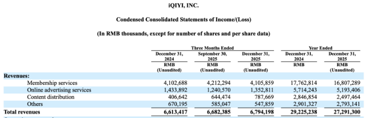 财报数据显示,公司2025年营收为272.9亿元,同比下滑7%;Non-GAAP(非美国通用会计准则)运营利润为6.4亿元,同比下滑73%;归属爱奇艺的全年净亏损达到2.06亿元,同比由盈转亏。