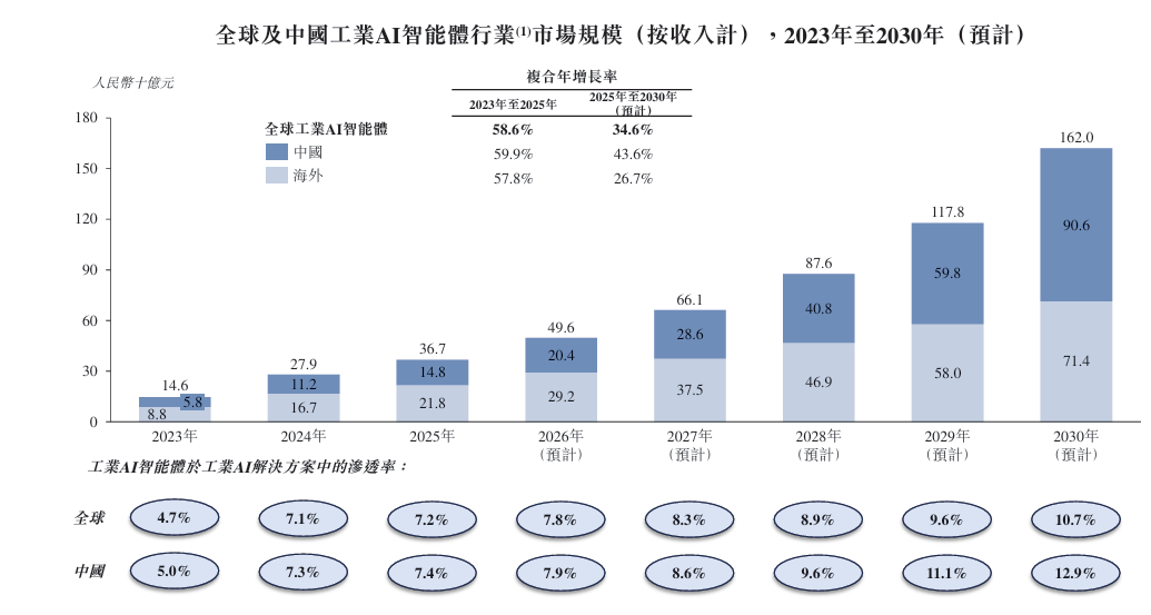 从行业环境来看,思谋科技所处的工业AI智能体赛道正处于快速扩张期。根据灼识咨询预测,中国工业AI智能体行业市场规模从2023年的58亿元扩大至2025年的148亿元,复合年增长率达59.9%,预计2030年将增至906亿元。