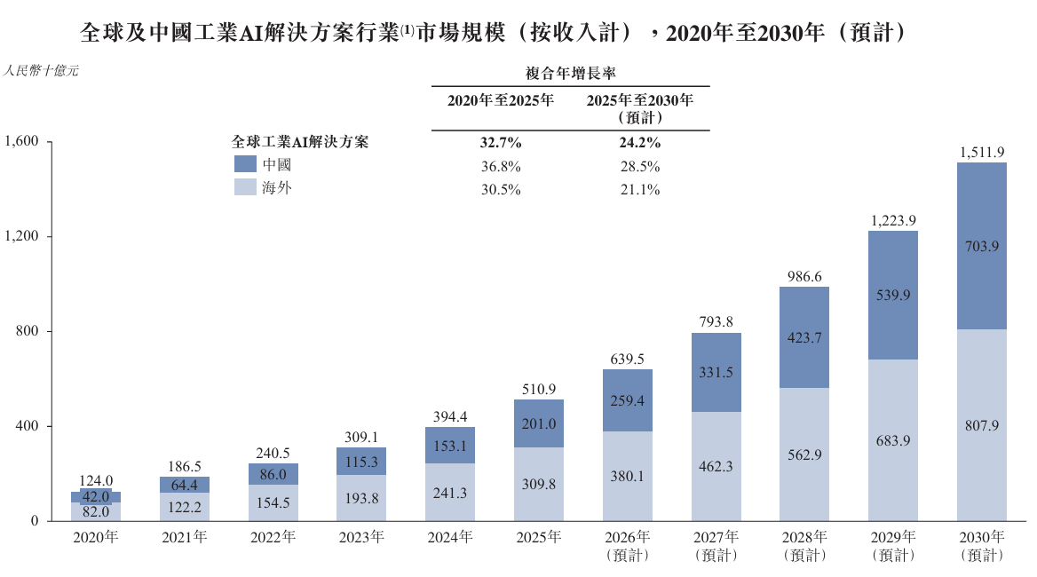 全球工业AI解决方案行业市场规模由2020年的1,240亿元扩张至2025年的5,109亿元,此期间的复合年增长率为32.7%,并预计至2030年将达到15,119亿元,2025年至2030年的复合年增长率为24.2%。