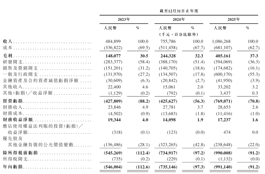 公司于2023年至2025年分别录得收入4.85亿元、7.56亿元及10.86亿元。同期对应年内亏损5.46亿元,7.35亿元及9.91亿元。经调整净亏损3.94亿元、3.79亿元、2.72亿元。