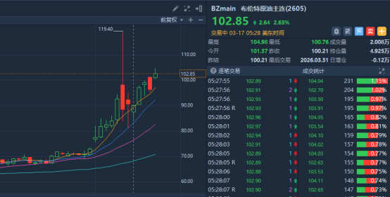 华盛资讯3月17日讯,美伊战争愈演愈烈,霍尔木兹海峡这一全球能源“咽喉”受阻,国际油价上演“过山车”行情,布伦特原油从战前的73美元一路飙升至3月9日超119美元,两周涨幅超45%,当前交易价约每桶103美元,而WTI原油价格也逼近每桶100美元,天然气价格同步走高。