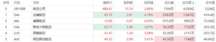 华盛资讯3月17日讯,美股航空股集体拉升!达美航空涨超5%,美国航空涨超4%,联合大陆航空涨近4%,西南航空涨超3%。