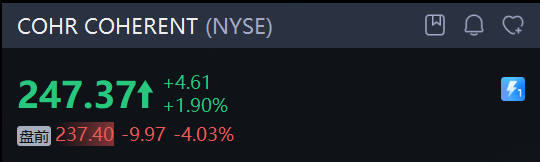 光通信概念股盘前集体回落, COHERENT跌超4%、Lumentum Holdings Inc.跌超3%,康宁 跌超2%。