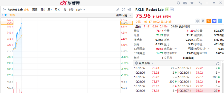 太空概念股飙涨!Rocket Lab涨超6%, $RDW 、 $ASTS 涨超5%,回声星通信涨近1%。