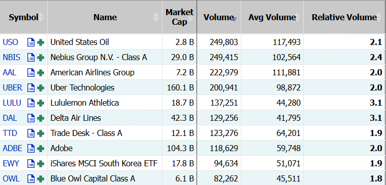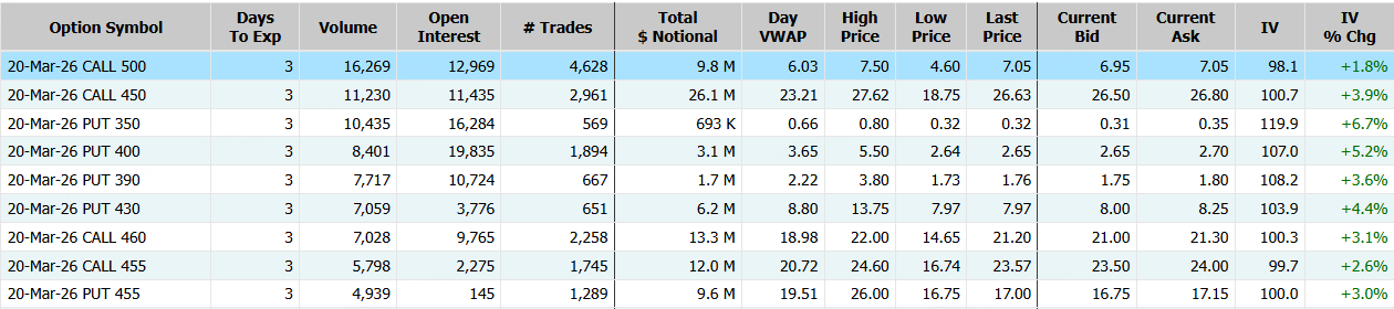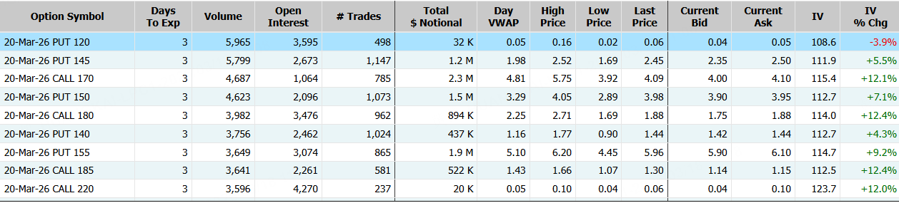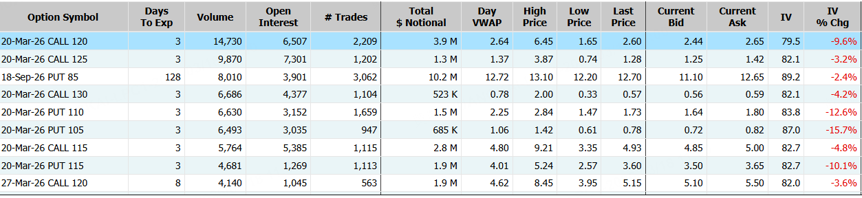 NEBIUS隔夜跌超10%,期权合约成交24.94万张,较90日均量放大2.4倍。3月20日到期的120美元的行权看涨期权交易量特别高,共有14,730份合约交易。 $NBIS 20260320 120.0 CALL$