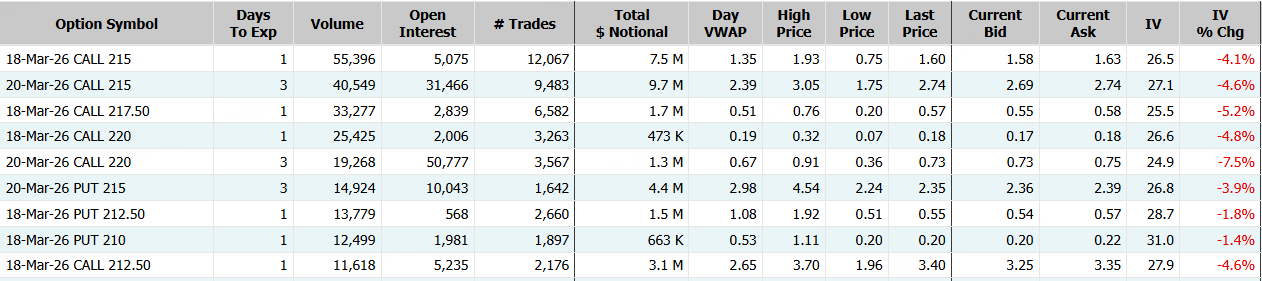 亚马逊隔夜收涨1.63%,期权合约成交56.99万张。3月18日到期的215美元的行权看涨期权交易量特别高,共有55,396份合约交易。 $AMZN 20260318 215.0 CALL$