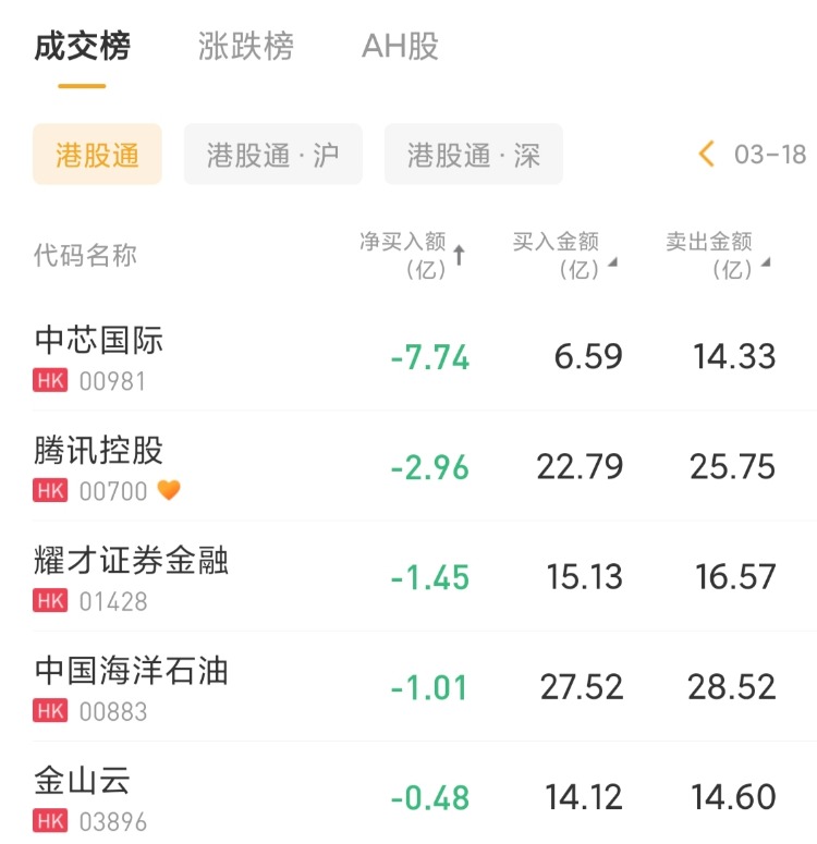 中芯国际 、腾讯控股、耀才证券金融分别遭净卖出7.74亿港元、2.96亿港元、1.45亿港元。