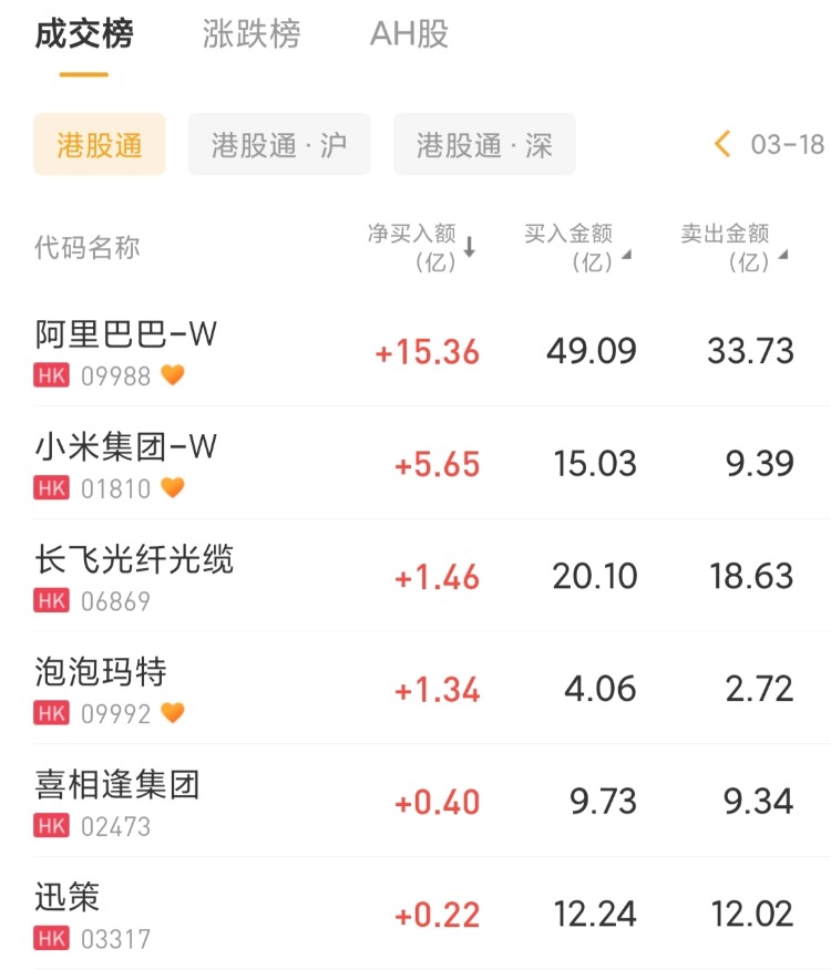 阿里巴巴-W、小米集团-W、长飞光纤光缆分别获净买入15.36亿港元、5.65亿港元、1.46亿港元;