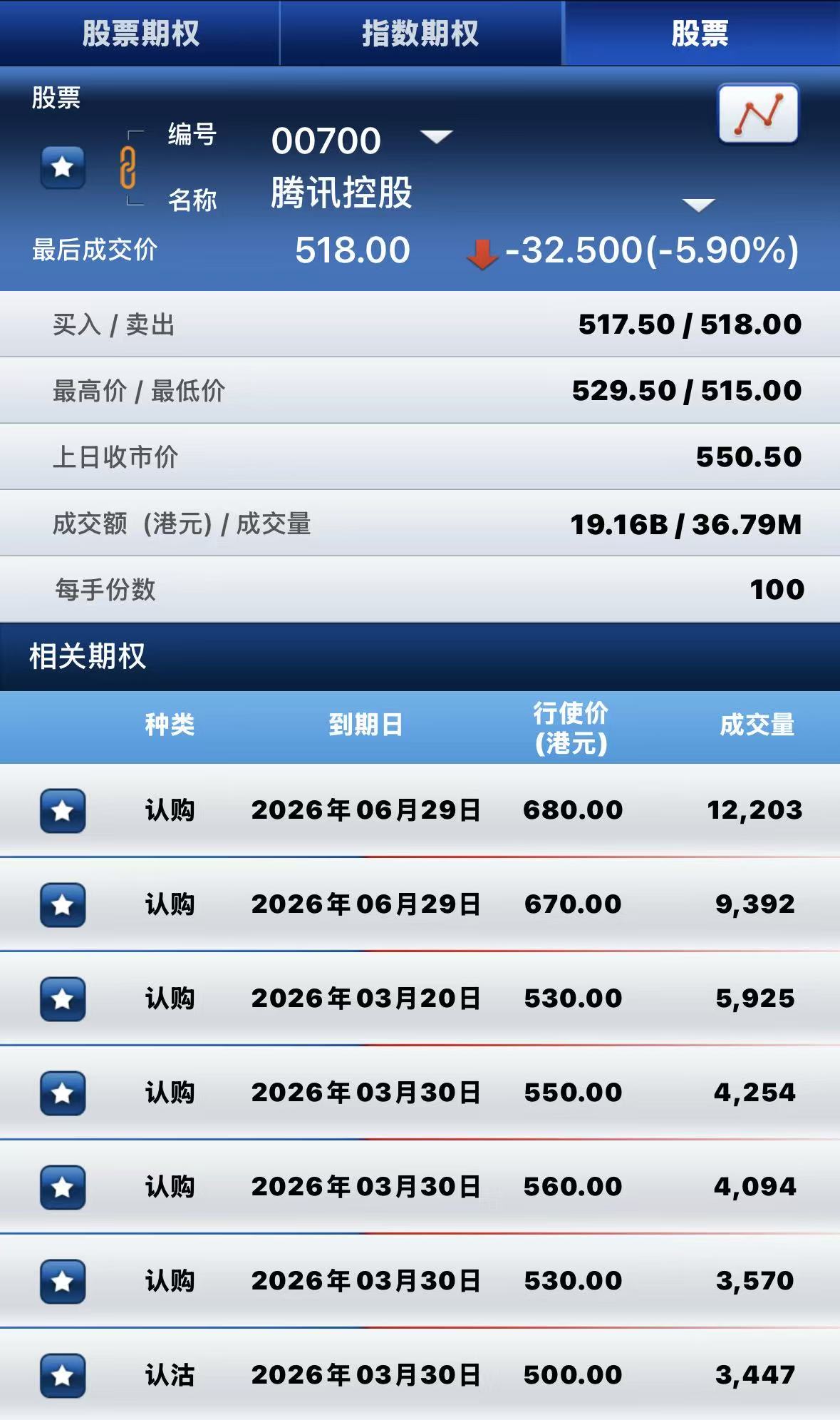 腾讯控股跌近6%,期权方面:半日成交超17.8万张合约,其中于6月29日到期行权价680港元的认购期权成交量居前,成交超12000张合约。 $TCH.HK 20260629 680.00 CALL$