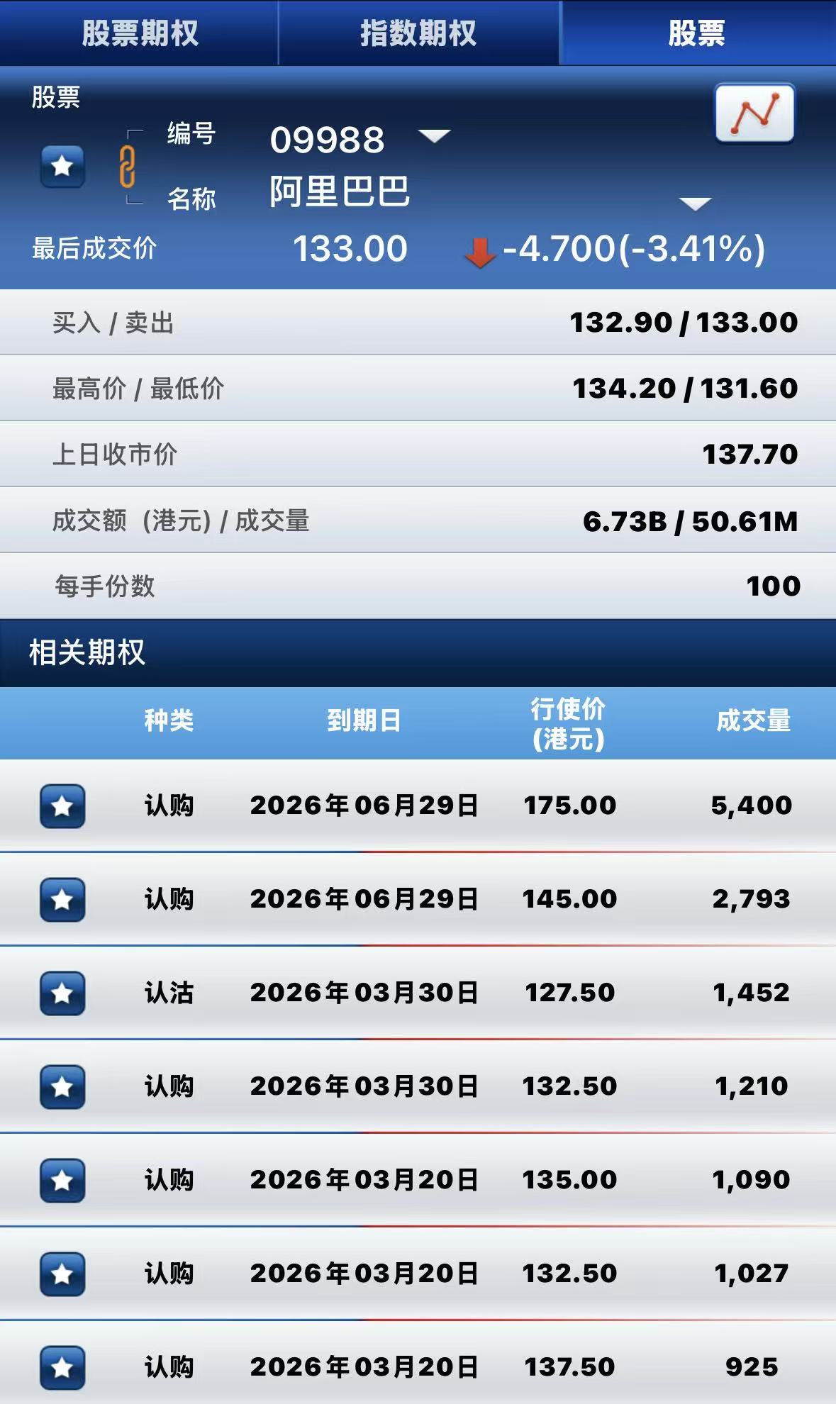 阿里巴巴-W跌超3%,期权方面:半日成交超3.6万张合约,其中于6月29日到期行权价175港元的认购期权成交量居前,成交5400张合约。 $ALB.HK 20260629 175.00 CALL$