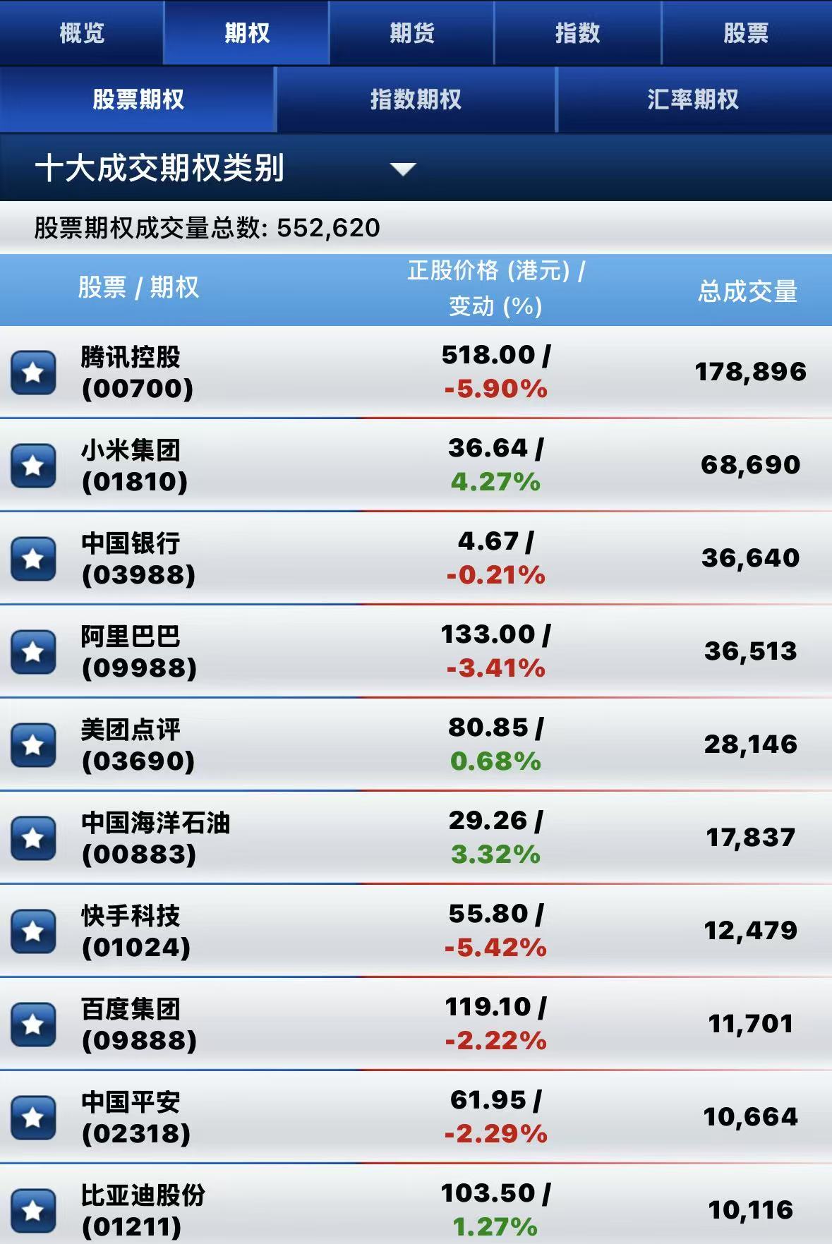 港股期权半日成交超55万张。其中,腾讯控股成交量居前,期权成交超17.8万张;小米集团-W名列次席,期权成交超6.8万张;中国银行位居第三,期权成交超3.6万张。