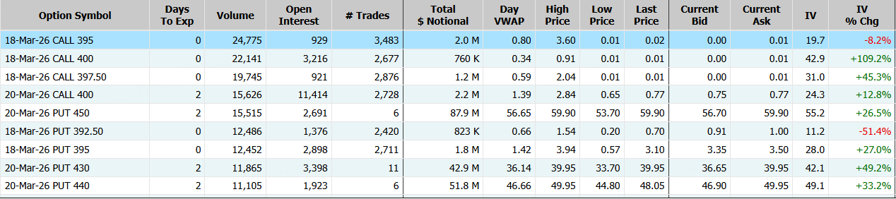 微软隔夜收跌1.91%,期权合约成交65.55万张,当日(3月18日)到期的395美元的行权看涨期权交易量特别高,共有24,775份合约交易。