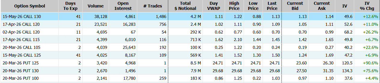 拼多多隔夜收跌3.50%,期权合约成交12.81万张,较90日均量放大2.1倍。5月15日到期的130美元的行权看涨期权交易量特别高,共有38,128份合约交易。 $PDD 20260515 130.0 CALL$