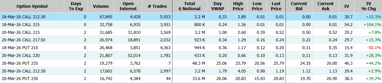 亚马逊隔夜收跌2.48%,期权合约成交67.10万张,当日(3月18日)到期的212.50美元的行权看涨期权交易量特别高,共有67,845份合约交易。