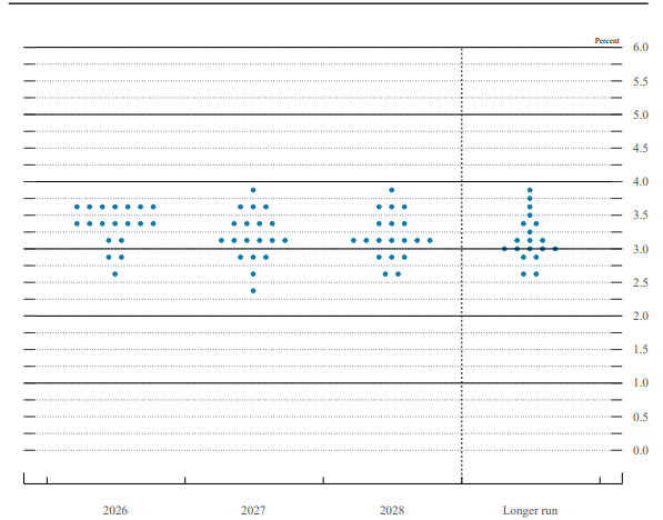 PCE通胀方面,2026年的预期则上修0.3%至2.7%(前值:2.4%),2027年预期上修0.1%至2.2%,2028年预测值与前值一致。