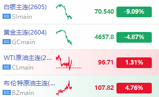 此外,据外媒,沙特延布港已经恢复装油作业。此前在沙特国防部称其在延布市上空拦截了一枚弹道导弹之后,延布港暂停原油装船作业。在伊朗事实上关闭霍尔木兹海峡后,延布港成为海湾阿拉伯国家石油仅剩的两条主要出口通道之一。截至发稿,美油期货涨超1%,布油期货涨近5%。白银期货大跌超9%,黄金期货跌近5%。