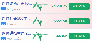 三大期指普跌,纳指期货 $NQmain 跌0.54%,标普500指数期货 $ESmain 跌0.38%,道指期货 $YMmain 跌0.37%。