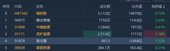 华盛资讯3月23日讯,煤炭股逆势走高,蒙古焦煤涨超5%,中煤能源涨超2%,兖矿能源涨超1%。