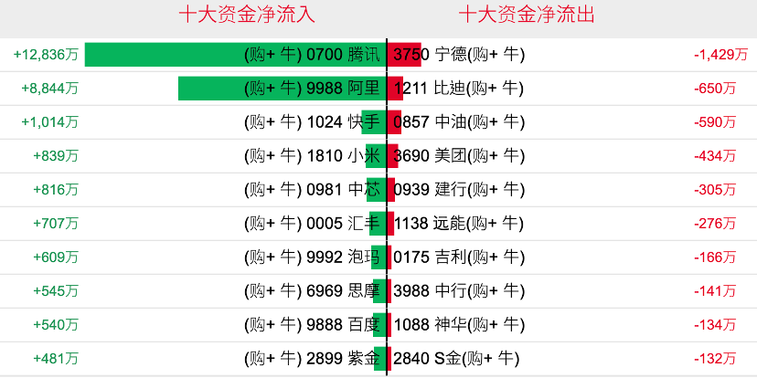 好仓(认购证及牛证)方面,过去5日,腾讯相关好仓录得约1.28亿港元资金净流入,为最大资金流入标的,阿里、快手及小米等相关好仓也分别约8844万、1014万以及839万港元资金净流入部署;宁德时代、比亚迪以及中国石油股份等相关好仓则分别约1429万、650万及590万港元资金净流出套现。