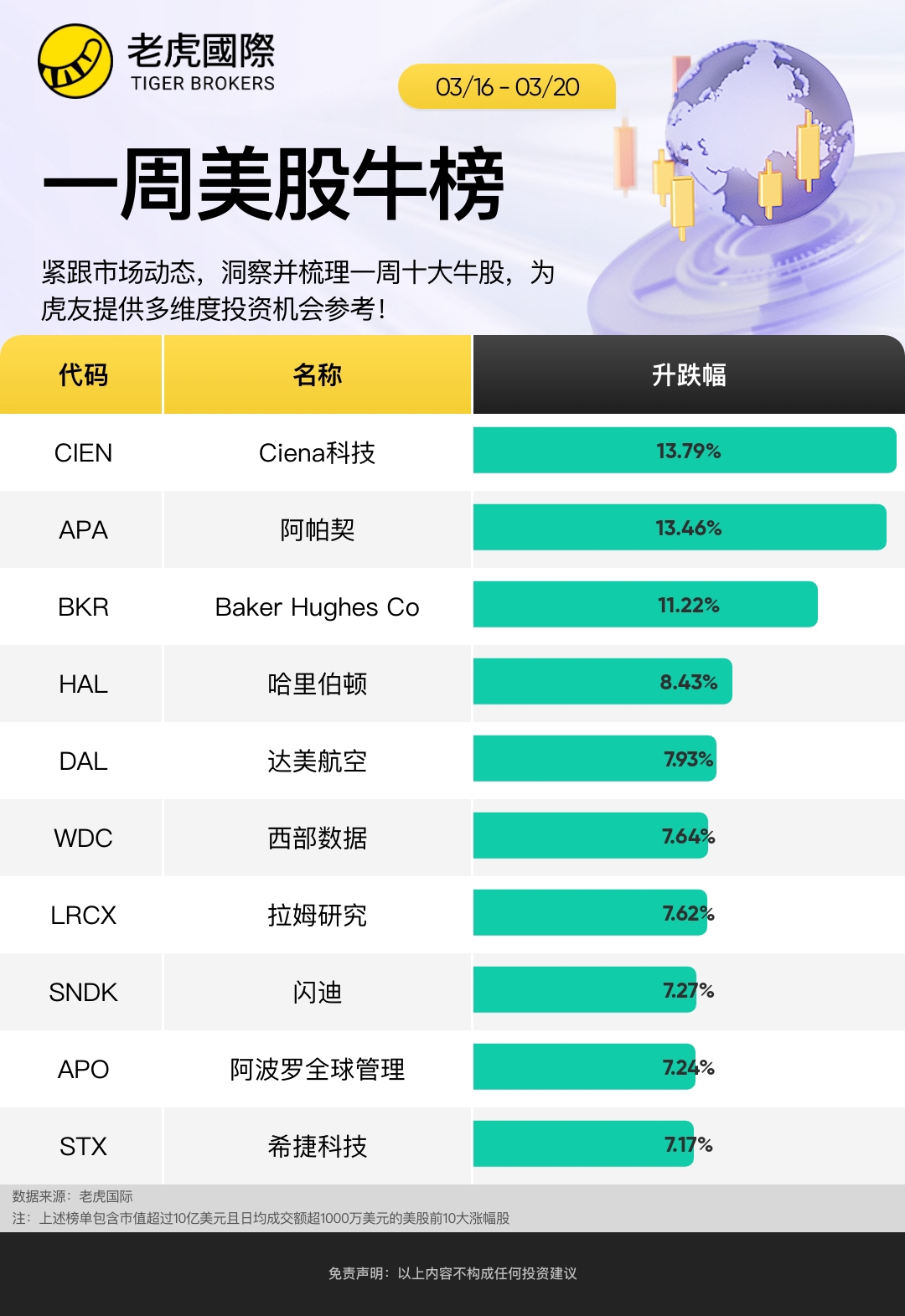 上周哪些股票表现优异?以下是截至3月20日当周,市值超过200亿美元的美国股票中涨幅前十名: