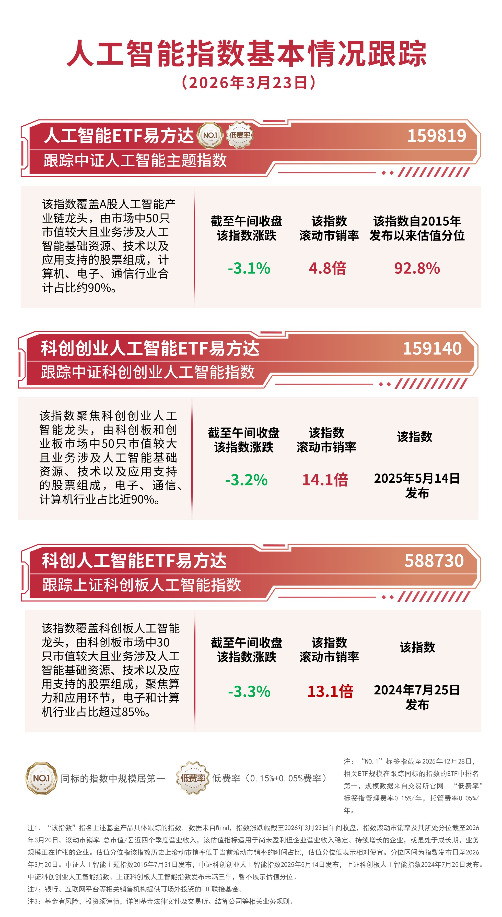 截至午间收盘,中证人工智能主题指数下跌3.1%,中证科创创业人工智能指数下跌3.2%,上证科创板人工智能指数下跌3.3%,资金逆势布局,人工智能ETF易方达(159819,联接A/C:012733/012734)半日净申购达1200万份。