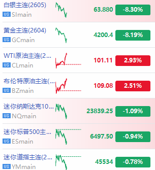 相关标的: $NQmain 、 $ESmain 、 $YMmain 、 $CLmain 、 $BZmain 、 $GCmain 、 $SImain