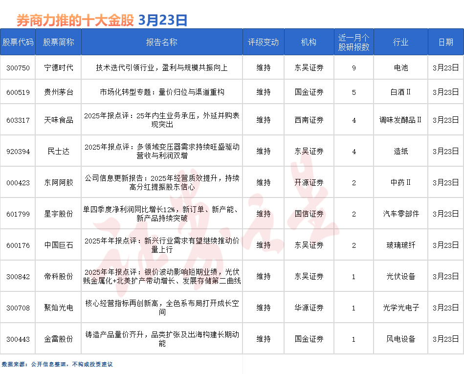 宁德时代最受券商关注,近一个月获西南证券、国信证券、开源证券、交银国际证券、中银证券、国金证券、东莞证券等9份券商研报关注,位居3月23日券商力推股榜首。